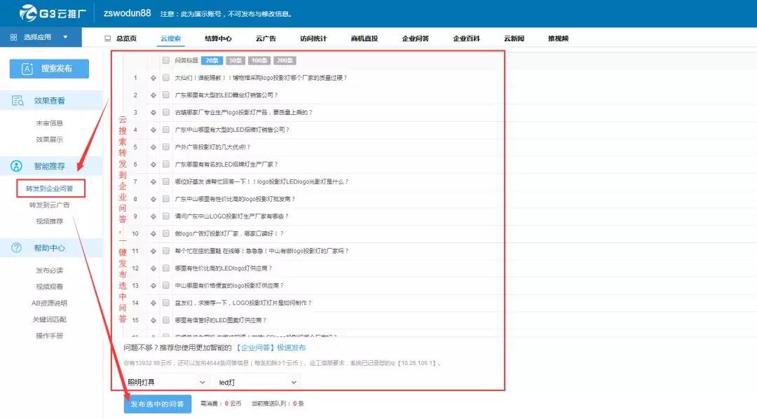 云搜索一键发布选中问答