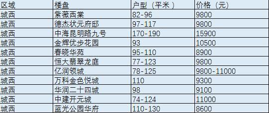 以上为城西主流楼盘中目前还有房源在售的项目,从户型我们可以看出,相比高新区,城西区域户型明显比高新区“刚需”了不少,户型在70-120平米区间内居多,而价位基本在向1万看齐。