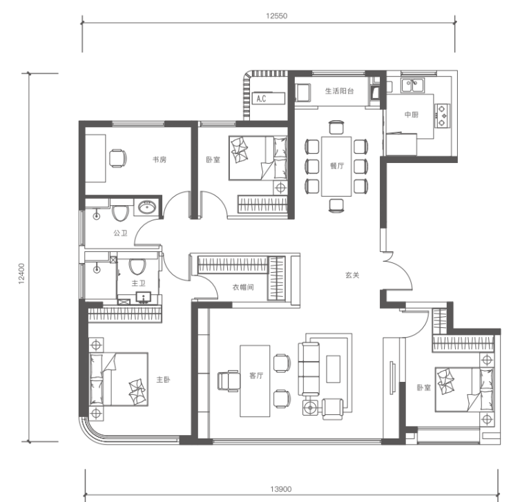 主卧套房+步入式衣帽间设计,北侧两个次卧同处静区。与动区空间再次分离,即使有家庭聚会,休息区也会非常安静,可满足三代同堂居住。也是目前高端改善迭代户型设计。