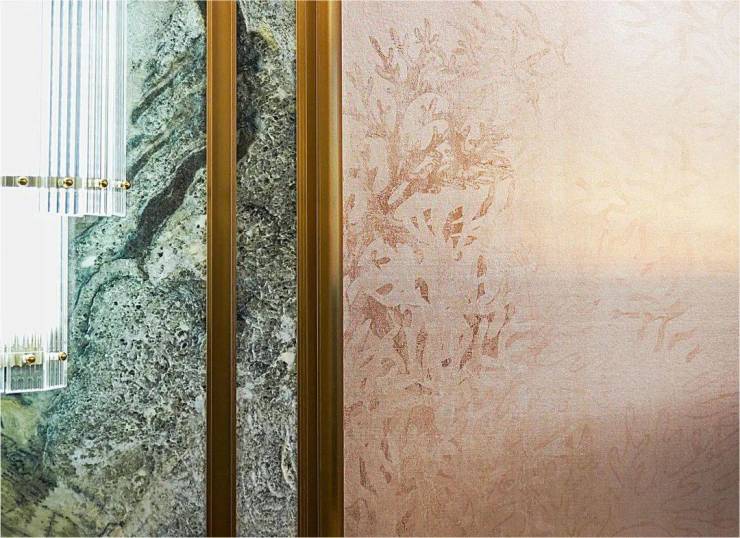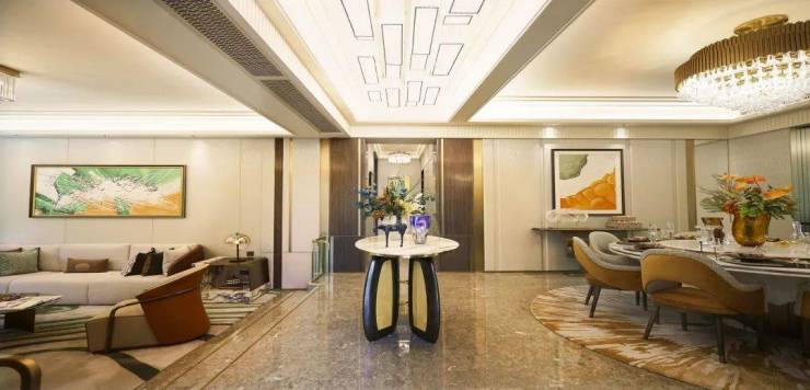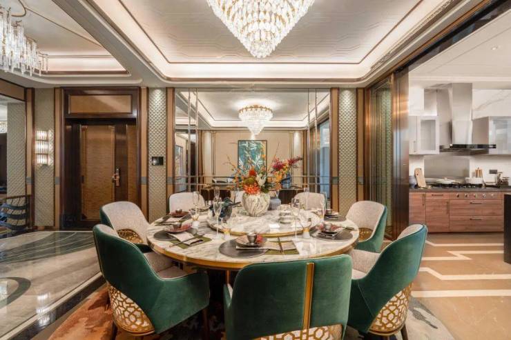 其二,从工艺的醇熟来看星河湾,石材无缝拼接、繁杂花饰镶嵌、材料切面倒角、玻璃花样等精湛工艺,更是巧夺天工。如每一块奢石都编号切割、打磨,严苛对应纹路零毫米误差拼接;壁纸、壁布的拼接也追求花纹的极致呈现,如此“用心”,才有了浑然天成的人居艺术之作。