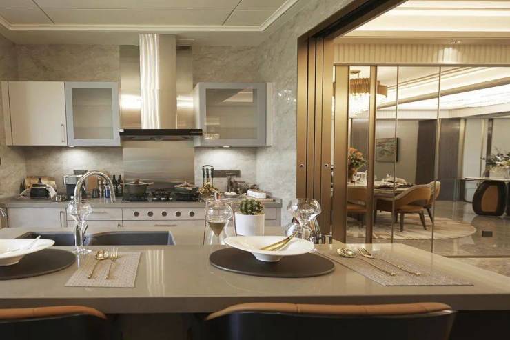 其二,“风格”定制化:不止是用材,不同户型还独享定制化风格,从入户门到入户玄关,从客厅、餐厅到厨房、卫生间,从电视背景墙到床头背景墙,不同区域的地面材质、墙体拼花等皆有不同,甚至大理石的切割曲线、不锈钢拉丝工艺、中央空调出风口造型等细节,也是各具独特魅力。