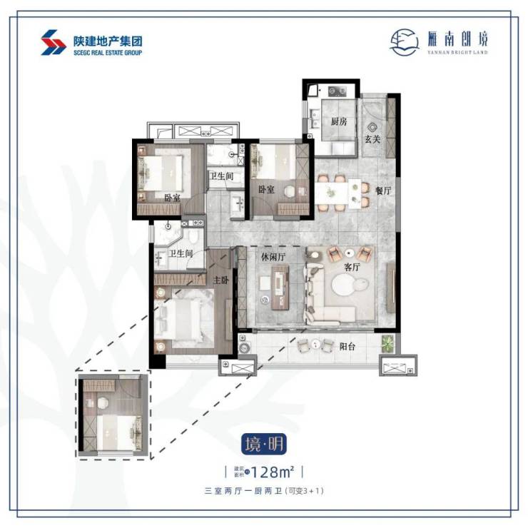 比如一直备受欢迎的建面约128㎡。三室两厅两卫设计,入户玄关、U型厨房、独立餐区依次入目,还有约6.8m奢阔横厅,超大揽景阳台,主卧套房设计,尺度和舒适度同类户型几乎无法媲美。