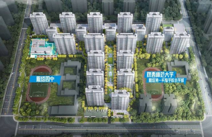 打开地图,这两所区域顶级教育资源-陕西师范大学雁塔第一实验学校小学部与雁塔四中(陕师大直管校区),就如同积木的两个拼图,恰好与“T”字型地块的雁南朗境构成了一幅四四方方的画。