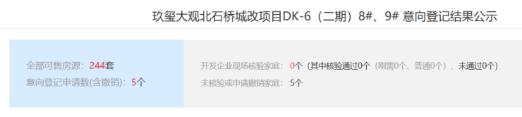 之前,位于高新旁大寨路的南飞鸿玖玺大观开启线上登记,昨天核验结果出炉,5个人登记,核验后5个家庭全部弃验(3个申请撤销,2个未核验)。