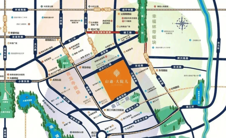 1.5公里内地铁3、5、8号线环绕,四横四纵八条城市主干道通达,1-3公里范围内有大雁塔区小学、交大附中,铁一中,曲江七小等37所学校环绕,曲江文化科教园在建的曲江5中-18-19学校,提供优质教育资源,3公里范围内有曲江创意谷等6个大型shoppingmall满足一站式购物,可谓住进繁华,一切悠然可得。