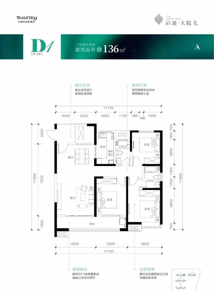 户型面积约102-156㎡,户型方正,南北通透,全明设计打造舒适人居。 启迪·大院儿项目北侧和西侧规划有约1万㎡商业街,项目南侧配套一所约2000㎡幼儿园。
