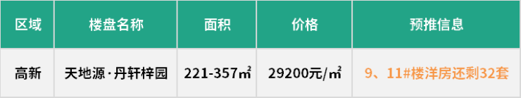 目前,天地源·丹轩梓园还有两栋洋房待售,总高10F,户型面积在221-357㎡,仅32套,整体均价为29200元/㎡。