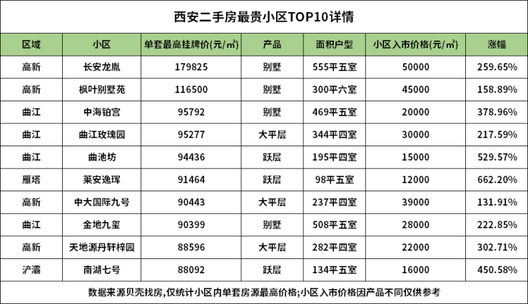 不完全统计,西安目前TOP10房源挂牌单价在8万-17万左右,清一色的大平层、别墅、叠拼产品,这些小区的入市单价在1.6万-5万左右,从涨幅来看,在2-6倍左右,成交价打个九折,也是普通人难以企及的价格。