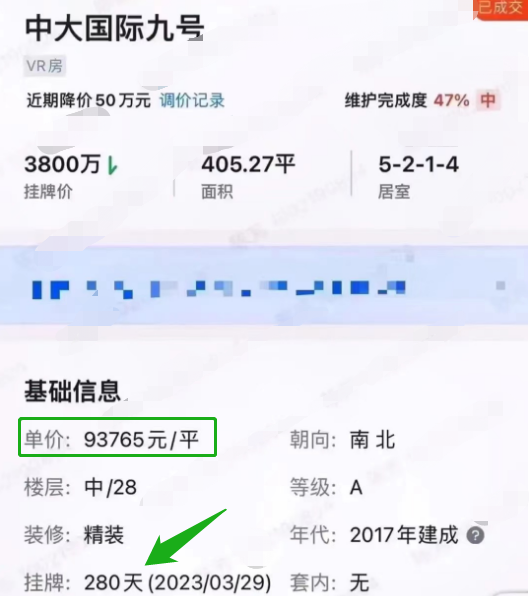 这是一套建面约405㎡的精装五居室,降价50万后,以3800万的价格成交,成交周期280天,折合单价93765元/㎡。