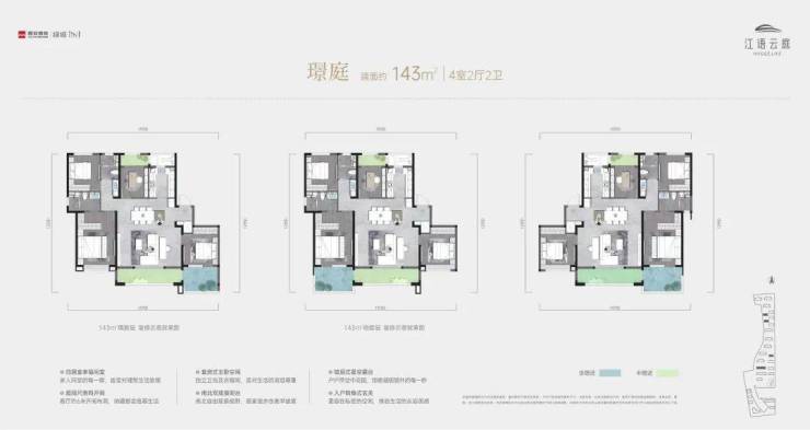 建面约143㎡「璟庭」偶数层,四室两厅两卫户型:作为万里挑一的云端之上的“空中院”臻品,空间尺度和功能诉求在此完美统一。