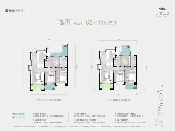 建面108㎡「逸语」偶数层,三室两厅两卫户型:临河唯一“双空中院”三居户型,几乎可以算作江语云庭留给年轻购房者的超级大彩蛋。