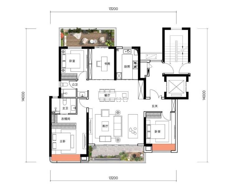 建面约143㎡户型:四室两厅两卫,“双跨”奢阔摘星露台。