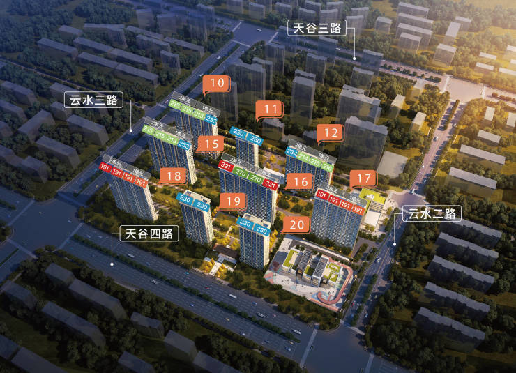 保利云谷天汇位于高新区丝路软件城云水四路与天谷二路十字西北角,项目1#、2#楼剩余部分房源,1#剩余少量143㎡户型,2#剩余少量185㎡户型,参考均价约25000元/㎡,预计2026年3月份交房。