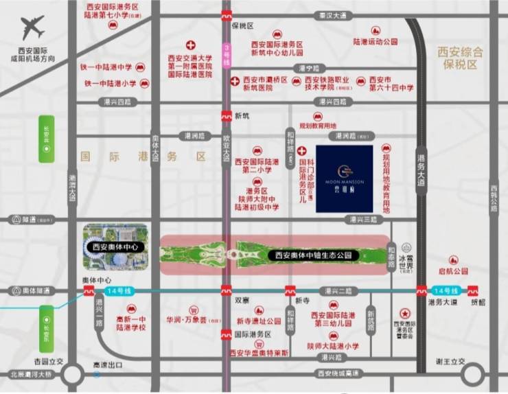 距项目约900米即是地铁14号线新寺站,乘坐该线路可以直达西安高铁北客站、西安咸阳国际机场,连接大型交通枢纽。同时该线路可换乘地铁2、3、4号线,乘坐地铁即可方便到达钟楼、小寨、大雁塔、高新、航天等多个商圈板块。