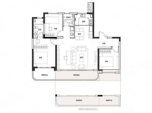 上图为建面约128㎡的三室两厅两卫,整体来看,户型方正,朝向为南北。约6.35米横厅,LDKG一体化家庭社交场。主卧套房设计,带有步入式衣帽间。南向宽境阳台长约13米,采用流线型曲面观景台设计。南向双卧设计,不仅具有良好的采光通风条件,而且也具备开阔的观景视野。