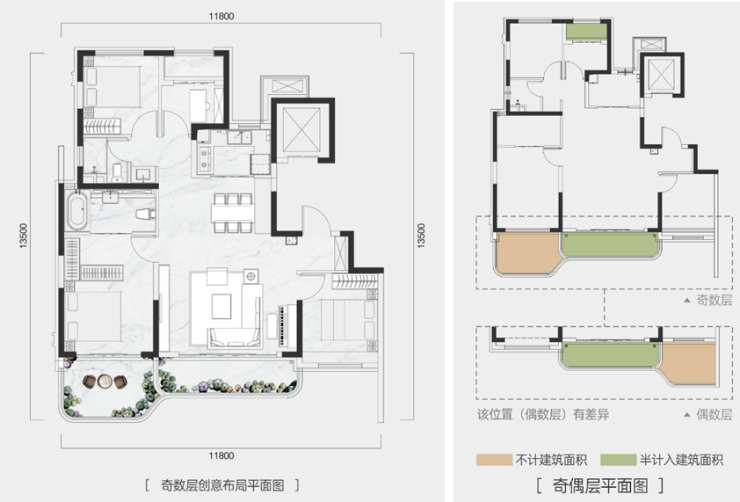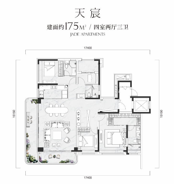 该户型客厅均采用端厅设计,270度采光,L型全景环幕露台,加上南向面宽约14.4米超大观景面,实现三面采光,将别墅级全采光“院落生活”直接搬到了洋房中。