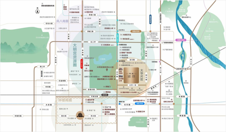 最大的优势是:二环内+大明宫遗址公园这个超级生态+历史IP。配套方面,二环内核心位置,周边地铁环绕,距离最近的含元殿站直线距离约700米,大华1935、大明宫万达、西京医院、大明宫遗址公园等都是西安顶级配套。