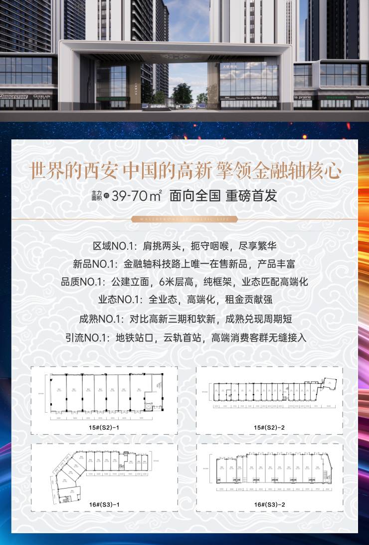 【产品面积】建筑面积约29-114㎡,户型方正,纯框架结构,紧邻地铁口与高新云轨首发站,适合多种高端业态入驻