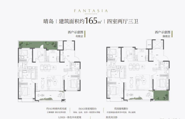 据悉,项目首开约143㎡及165㎡的四室洋房产品,两者户型的奇偶层布局几乎一样,只是165㎡面积更大。其四居均为主次卧双套房设计,且将两套房分置于居室东西两侧,奇数层均为南北双阳台设计,偶数层则全为南向阳台。