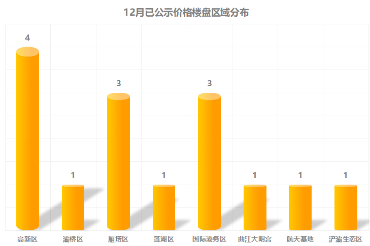 根据价格公示平台的信息来看,截至发稿12月共有17盘次进行了意向登记,其中主城区15盘次,主要集中在8个区域,其中高新区、国际港务区和雁塔区三区域目前分别有4盘、3盘和3盘进行了价格公示。