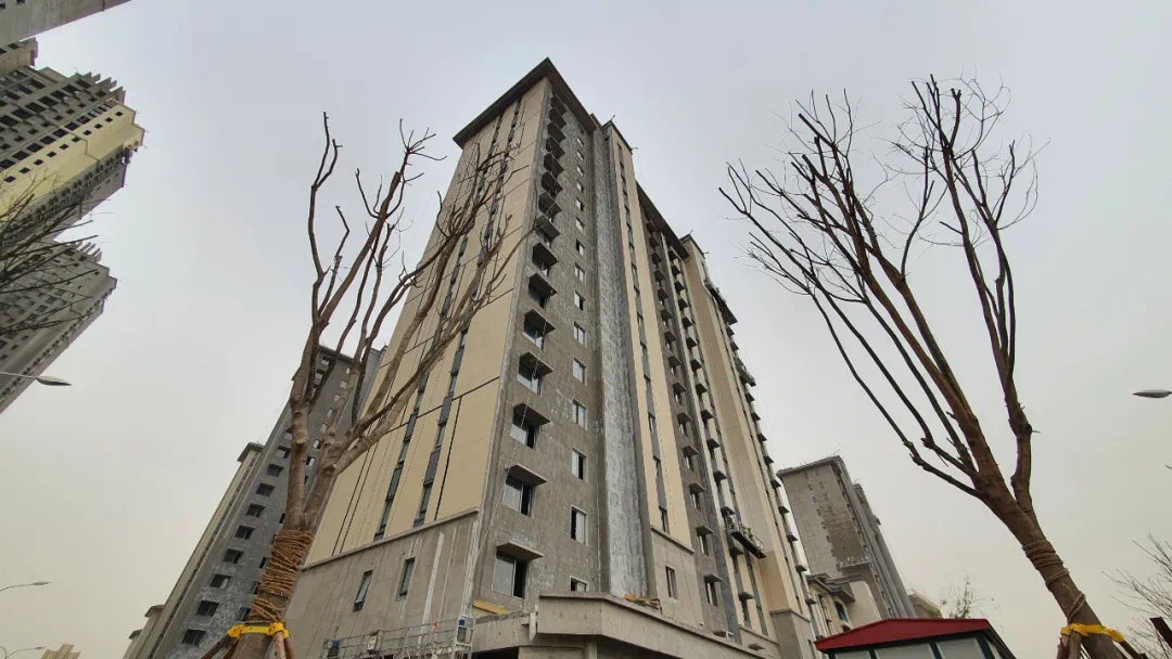 楼栋外部,有工人正在通过吊篮进行外部的装饰。靠后方的楼栋保温层,还裸露在外。现阶段正以外立面部分施工为主。道路及绿化,楼栋内部的装饰、装修同步进行当中。