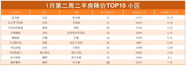 1月第二周西安二手房降价小区top10