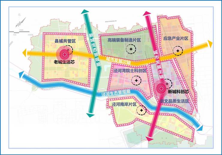 泾河新城是国家级新区——西咸新区的五大组团之一,区域占位西安北跨正北中轴位置,也是中国大地原点所在地和古丝绸之路起点。区域提出实施“一塔(崇文塔)一点(大地原点)一河(泾河)一湖(崇文湖),两城四区,四纵四横,七大产业”的新发展战略,致力打造西安北跨战略下极具影响力的“科技中心、创新中心、人才中心、休闲宜居中心”的现代化新城。