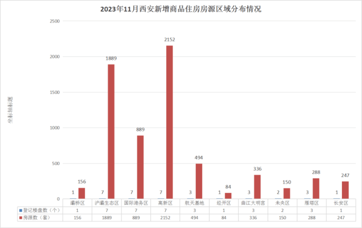 从区域分布来看,高新区、浐灞生态区、国际港务区是当月的供货大户,新增登记楼盘均为7个,新增供应量分别达到了2152套、1889套、889套,尤其是前两个区占到全市供应量的60.45%,超过六成。