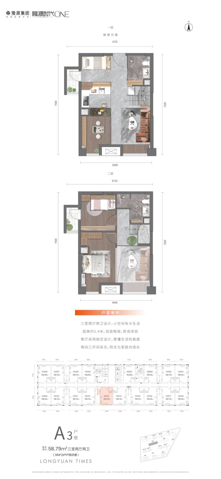 建筑面积约50-85㎡精奢著作,荣耀面世。层高约5.4米,打造双层生活,三室两厅两卫格局,满足一家人的阔朗生活,双气入户、动静分区合理,工作、生活、会客……多种生活形态融为一体,充分满足你所需要的style。