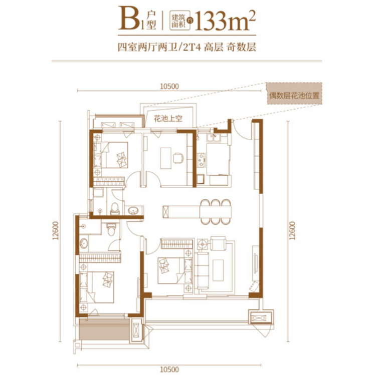 纵观西安,133的四室配置在西安还是很罕见,现在很多楼盘都流行2T2的设计,143㎡都是3房,更不用说130㎡出头的面积了。