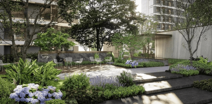 依台势铺陈造景,缔造山巅上的郁林、山谷中的溪水和山麓里的烟火的三重景观序列,以祥屿独有的山形及景点为蓝底,景点在山林中穿梭,一切生活场景掩映于自然中。在场景营造中,落位“两盒两场"的社交场,营建一半烟火日常,一半山水诗意的生活日常。