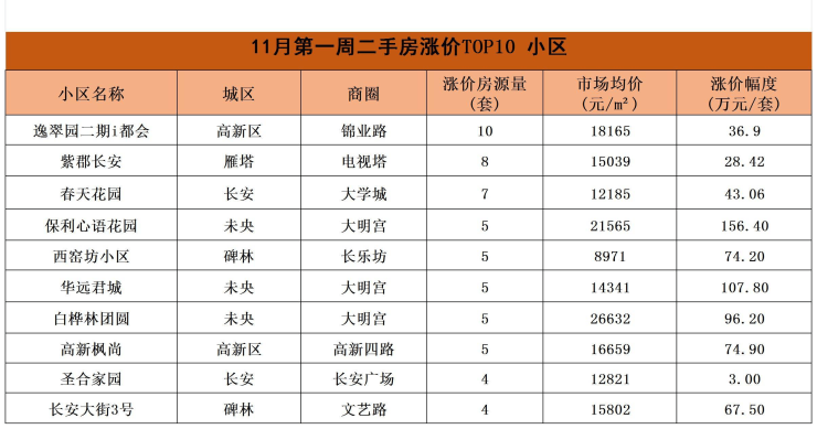 新鲜出炉!西安11月第一周二手房涨跌排名前10小区!