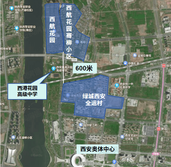 这个小区就是位于港务区秦汉大道北侧的西航花园。从百度地图上看,西航花园离绿城全运村仅600米,离奥体场馆约2公里。