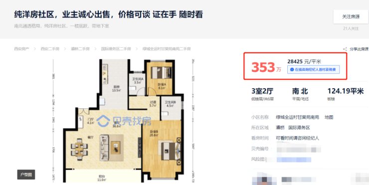 而秦汉大道南侧的绿城全运村,二手房挂牌价普遍2W+/㎡,甘棠苑一套6层洋房124㎡的三室,挂牌单价约2.8万元/㎡,总价353万。