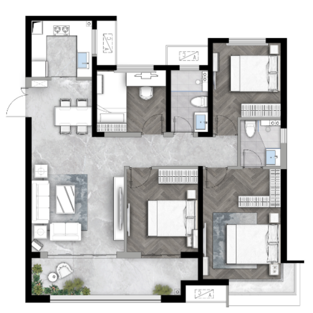 而项目的这个户型,区别于市面上常见的三室一卫设计,竟在99㎡的空间里打造出了三室两卫,且是全明三室,实用性非常强。