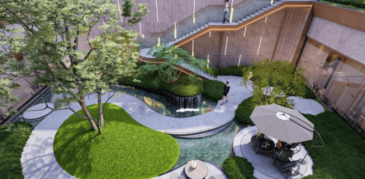 景观园林由山水比德执笔设计,以自然灵动、流动诗意、现代艺术为创作手法,规划“两轴一环,三庭九境”。打造艺术化的现代自然新山水生活场景,并通过空间的轴线仪式感层层递进将其动线串联。