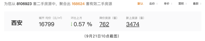 诸葛找房数据显示,9月21日上午,西安二手房挂牌量为168624套;