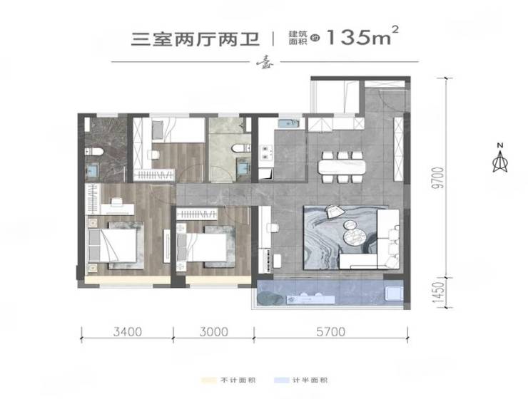 3室2厅2卫1厨, 135平米