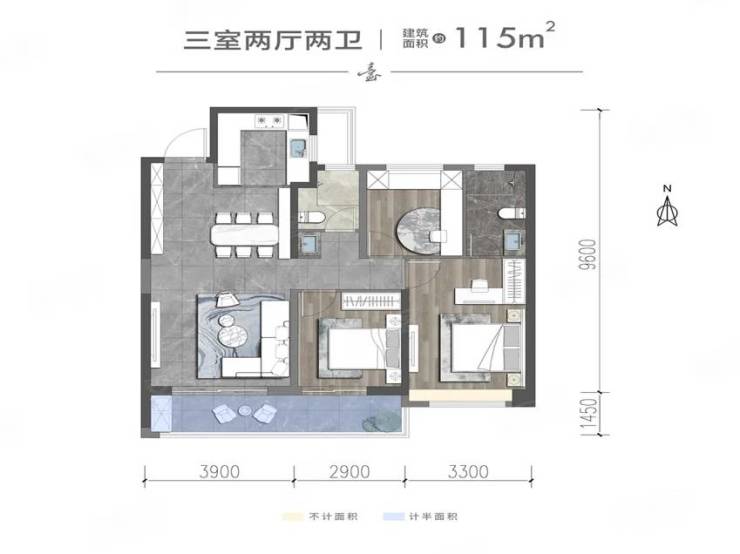 3室2厅2卫1厨, 115平米