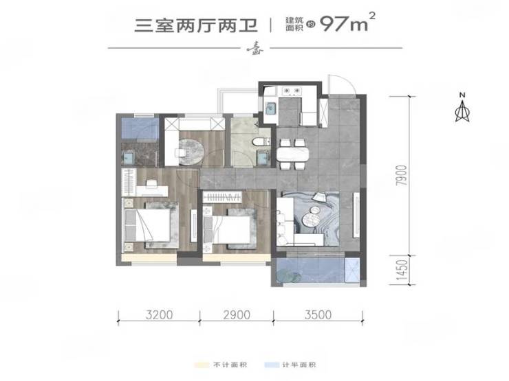 3室2厅2卫1厨, 97平米