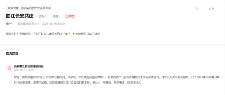 不过,关于这片共建区,目前还未看到有实质性的动工迹象,就在近期还有网友咨询:曲江长安共建签约快一年了,什么时候可以动工建设?