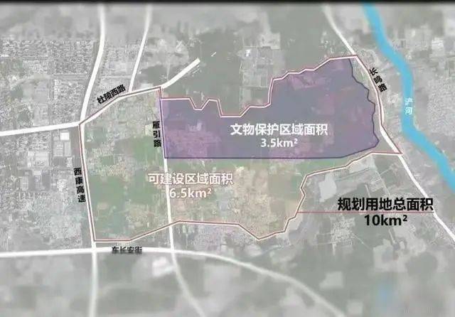 共建区范围北至长安区与雁塔区行政界限,东至长鸣路,南至杜陵保护线、西至西康高速。规划用地约10.53平方千米,其中文物保护区面积为3.5平方千米,可建设区域面积为6.5平方千米,折合单位后,共计约15000亩用地。