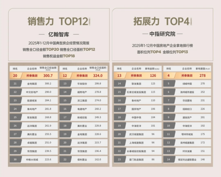 从最新发布的2025年1-12月典型企业销售情况来看,邦泰2025年销售额首破300亿,以300.7亿全口径销售金额位列第20名,以324万mi全口径销售面积位列第12名(数据来源:亿翰智库)。操盘金额与面积双双稳居全国TOP20阵营。(数据来源:“中国房企稳健经营十强"由亿翰智库于2023年授予邦泰)