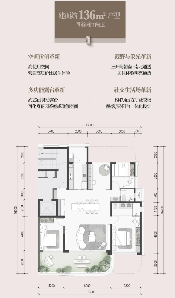产品业态:纯2梯2户建面约132-185m都市度假栖心社区