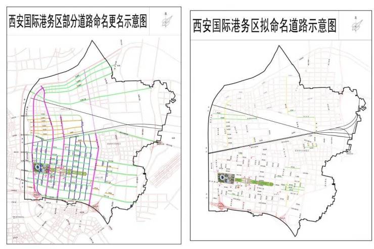 同时,官方在2020年(图左)和今年10月(图右)发布的西安国际港务区部分道路更名的示意图中也有明显标注了观澜路和灞渭大道,从道路规划和定位来看,灞渭大道向北延伸的可能性非常大。