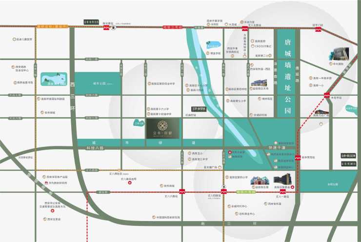 交通配套:丈八六路(6号线)、丈八收费站(西安绕城高速公路入口西向)、化龙一路科技七路口[公交站]、丈八四路(6号线)、丈八收费站(西安绕城高速公路出口方向)、丈八六路科技八路口[公交站]、造字台(6号线)、河池寨收费站(G5京昆高速入口)、化龙二路科技七路口[公交站]、丈八一路(6号线)