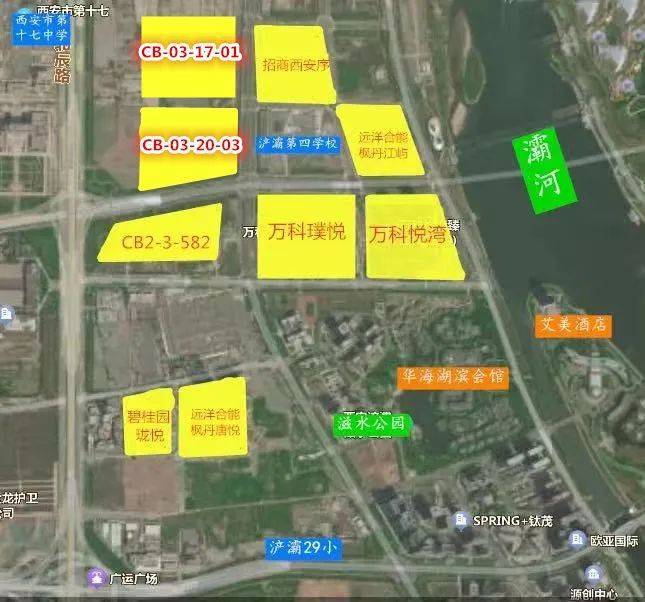 其中,地籍标号CB-03-20-03(CB2-3-586)宗地占地约139.65亩,容积率仅为2,地块原为东方红村所在地,东北角紧邻千万豪宅——招商西安序, 东侧紧邻的是浐灞第四学校,不远处为灞河。