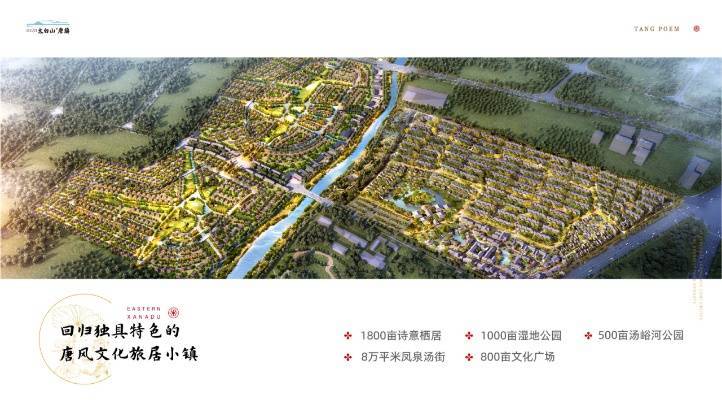 项目总占地1800亩,东侧一地块约520亩,由200亩的商业配套及350多亩温泉叠拼组成。河西侧是二地块,约1300亩地涵盖住宅、商业以及一个 380多亩的业主众筹农场组成,也是儿童的自然教育基地