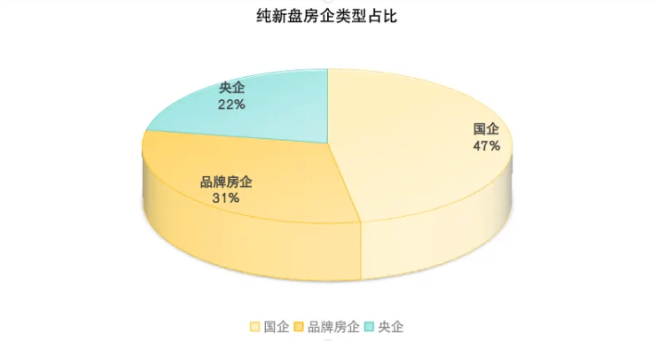 而就这些纯新盘信息来看,能发现目前市场依旧是国央企产品占比量较大,品牌房企虽然也有部分新盘,但占比量相对较小,仅有31%,其余的69%纯新盘均是国央企打造。