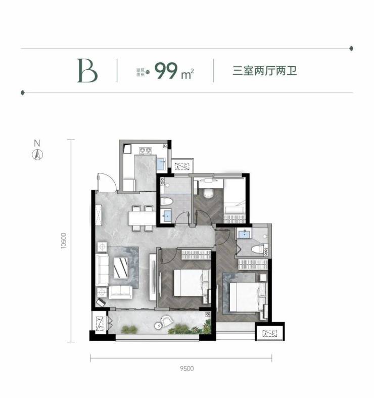 约99㎡户型,三室两厅两卫的空间布局,既能满足刚需、刚改购房者的居住功能满足,双卫的设计,也使得后期入住之后的居家生活游刃有余,多一个卫生间和主卧独立卫浴的好处,只有住过的人才知道。